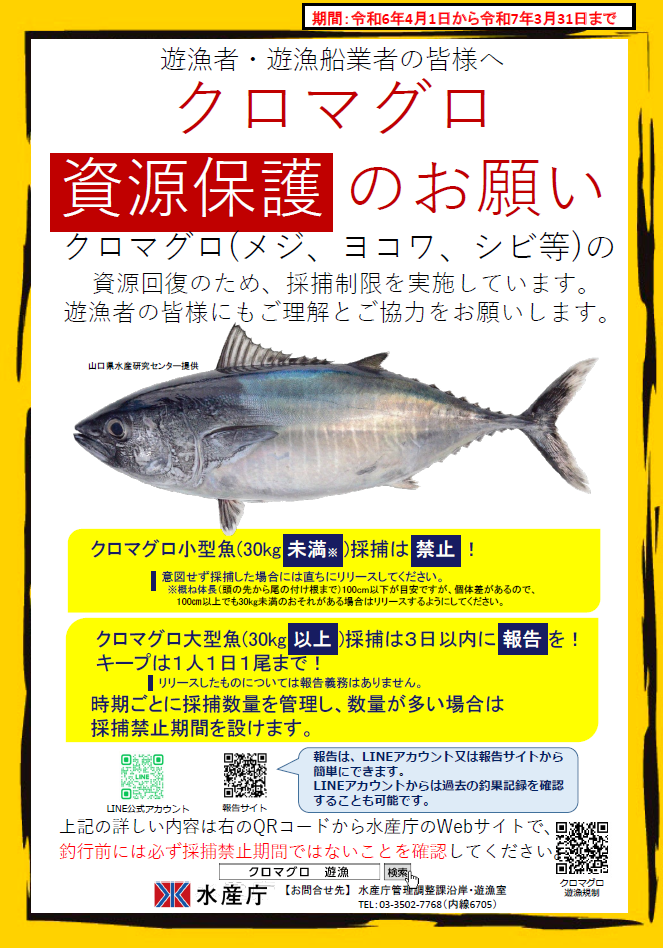 ※クロマグロは資源保護の観点から厳しい規則があり釣れた場合報告義務が発生するなど決まりがあります。