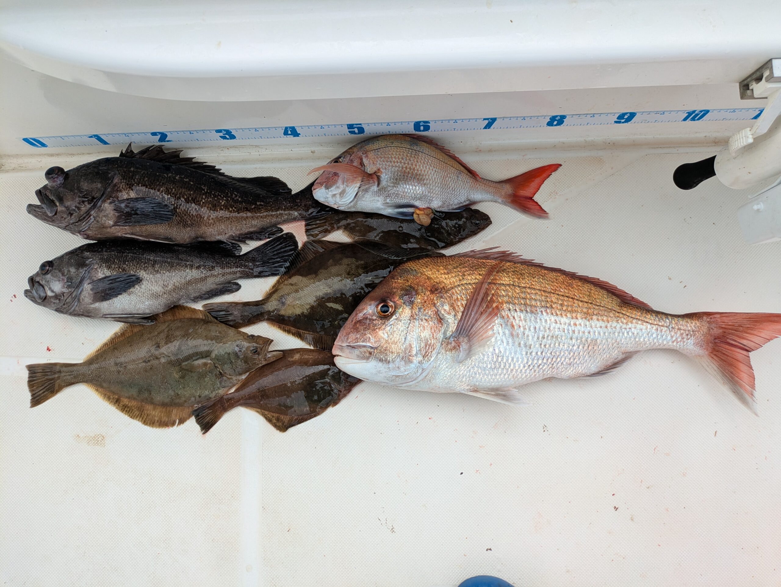朝一、うねりがあり佐渡沖には出れそうになく、しばらく近海で真鯛に遊んで頂きました。
