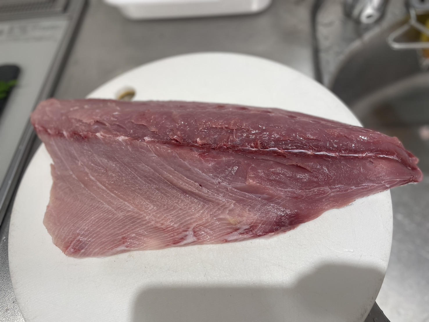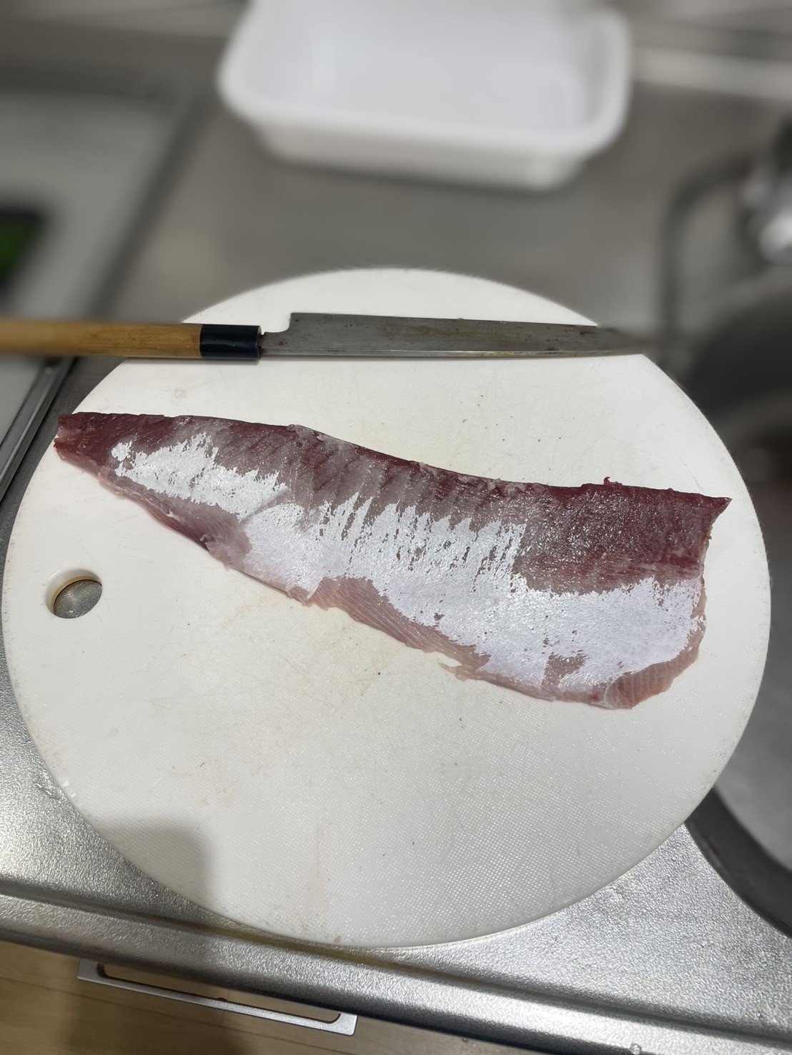 その日のうちに内臓、頭だけ落として1日寝かせてます。 正直この時期なのであまり期待はしていませんでしたが、腹身に脂が見えたのでどんなものかなと。
