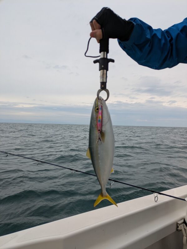 朝一ベタ凪の中出船です。 徐々に風が強まる予報でしたので浅場から様子見です。 しかし魚探が好反応の中、なかなか口を使ってくれず、風も吹き始め厳しい状況。 あちこち浅場のポイントを回りますが変わらず。